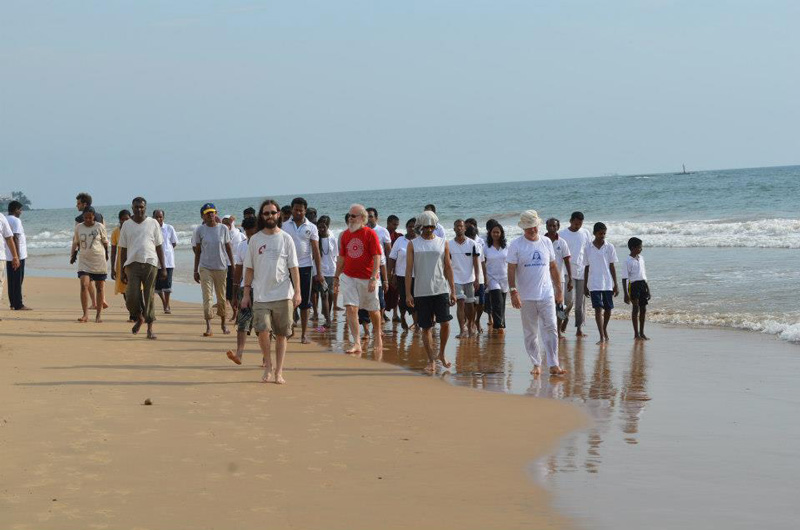 M.G. Satchidananda und die 48 Teilnehmer einer 2. Einweihung in Kriya Yoga und eines Schweigeretreats bei einem Strandspaziergang vor dem Sri Lanka Ashram der Babaji’s Kriya Yoga Orden der Acharyas Stiftung in Colombo am 9. März 2013